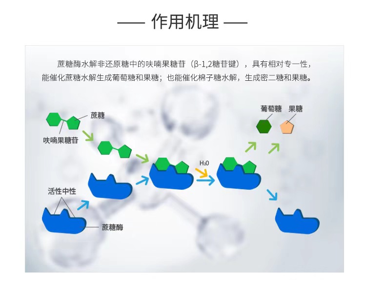 Invertase, also known as fructofuran hydrolase, derived from saccharomyces cerevisiae strains, is a food enzyme preparation refined from liquid deep fermentation.Invertase(fructofuranoside fructohydrolase) specifically catalyzes the hydrolysis of β-D-fructofuranoside linkages in non-reducing sugars with relatively specific properties. It not only catalyzes the hydrolysis of sucrose to glucose and fructose, but also catalyzes the hydrolysis of raffinose to produce mithiose and fructose. Invertase has high catalytic activity and wide substrate specificity. By adding an appropriate amount of invertase, you can accelerate the production of glucose and fructose, improve the taste and sweetness of the product, and reduce the adverse effects of sucrose on human health.