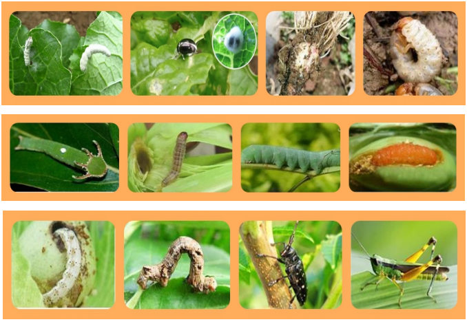 Pine caterpillars, corn borers, grubs, locusts, potato beetles, pine brown beetles, termites, tea leafhoppers, cotton bollworms, berry borers, peach mealworms, leek maggots, flies, mites, psyllids, etc.