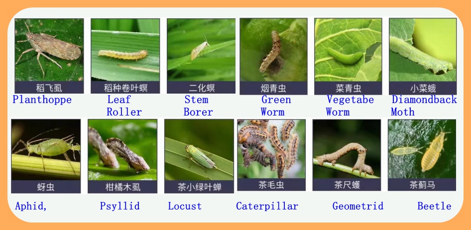 Planthopper, leaf roller, rice stem borer, tobacco green worm, vegetable green worm, diamondback moth, aphid, psyllid, caterpillar, tea geometrid, beetle, locust, etc.